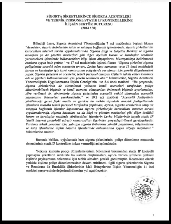 Sigorta Şirketlerince Sigorta Acenteleri ve Teknik Personel Statik IP Kontrollerine İlişkin Sektör Duyurusu 27 Kasım 2014 - 23:40 Bu haber 593 defa okunmuştur. Paylaş Tweetle WhatsApp YORUMLAR 0 Yorum adlı kullanıcıya cevap CİDDİ MESAJLAR SAB - MALTEPE ÜNİVERSİTESİ - İŞTE OL AKADEMİ İşbirliği ile SİGORTA TEKNİK PERSONEL EĞİTİMİ TOBB-SAİK Nisan Ayı Toplantısını Yoğun Gündem Maddeleri İle Gerçekleştirdi. Hasar Destek Merkezi ile Hayat Kolaylaşacak! 2014/29 sayılı “Sigorta Acentelerinin Şube Açma İle İlgili Kurallara Uyumu Konusunda Sektör Duyurusu Allianz Sigorta, acenteleriyle Kıbrıs’ta buluştu